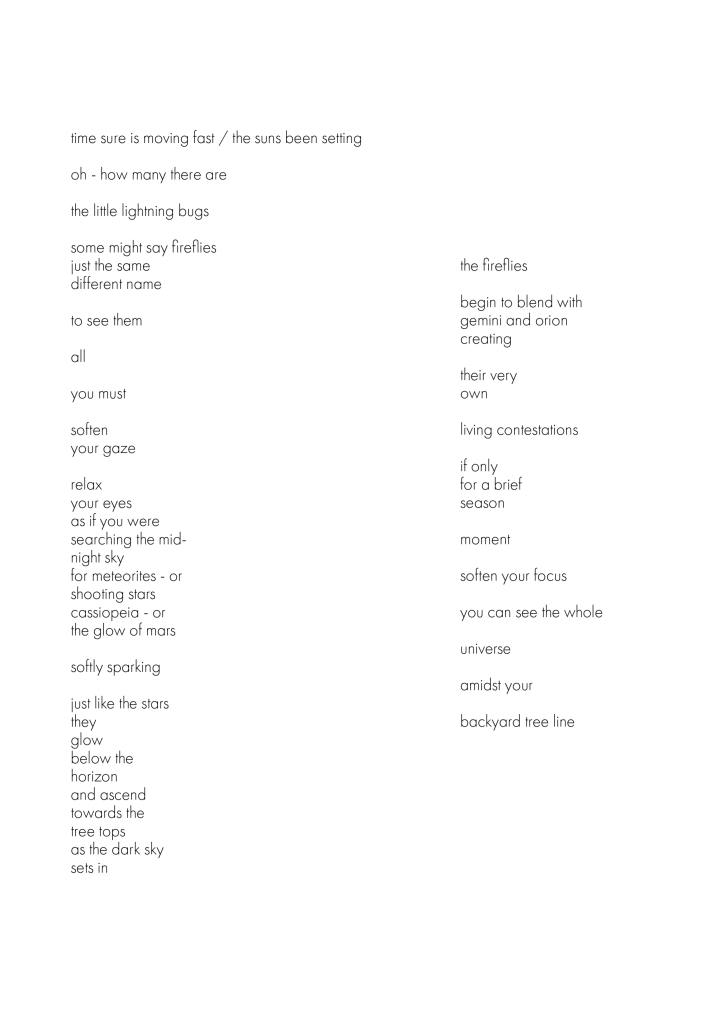 lightning bugs…fire flies… Posted on June 30, 2023 sparkle in the summer southern skies Share this: Click to share on Facebook (Opens in new window) Facebook Click to share on Reddit (Opens in new window) Reddit Click to share on Tumblr (Opens in new window) Tumblr Click to share on Pinterest (Opens in new window) Pinterest Click to share on LinkedIn (Opens in new window) LinkedIn Click to share on X (Opens in new window) X Click to email a link to a friend (Opens in new window) Email Click to share on Pocket (Opens in new window) Pocket Like Loading...
